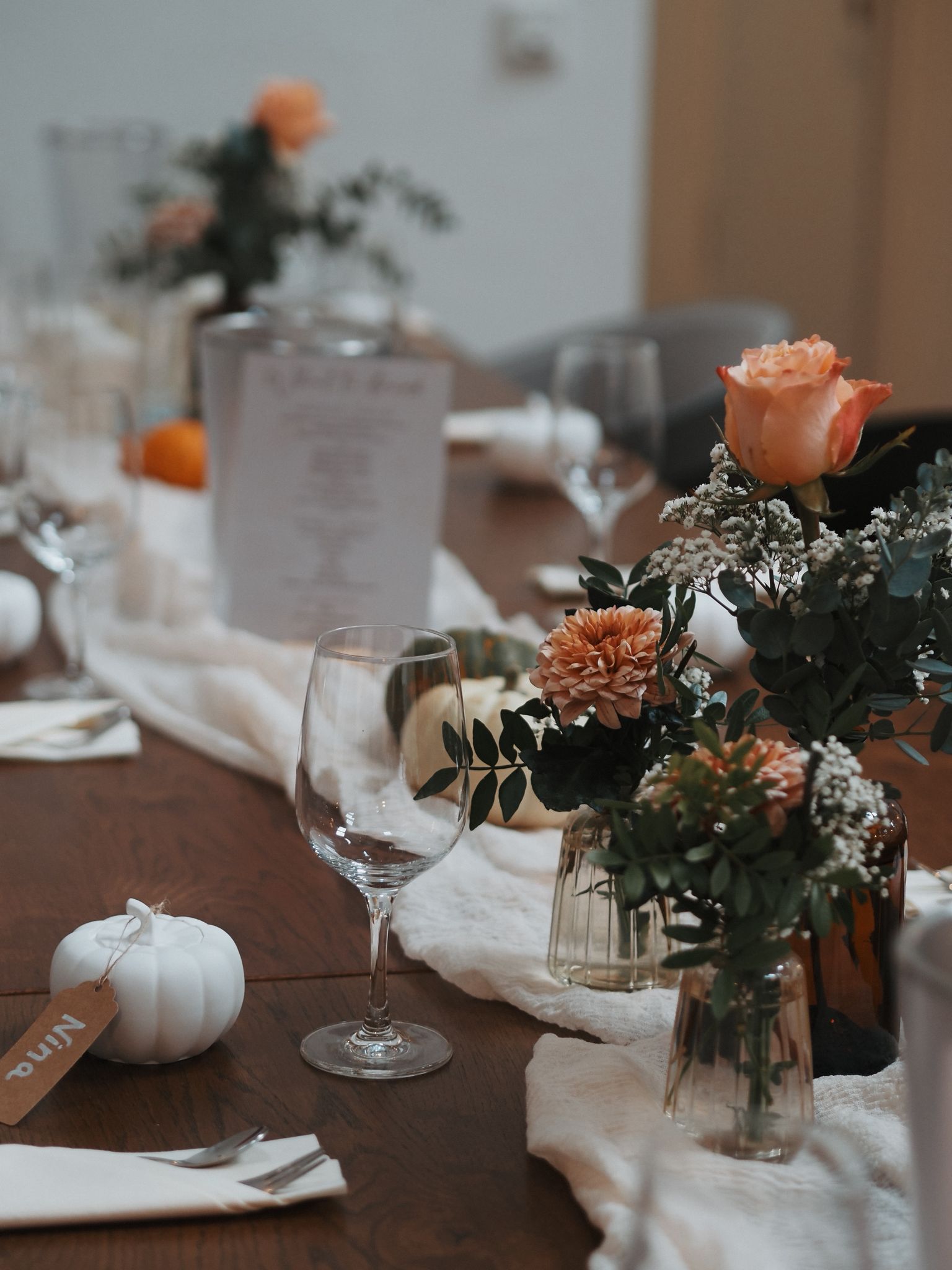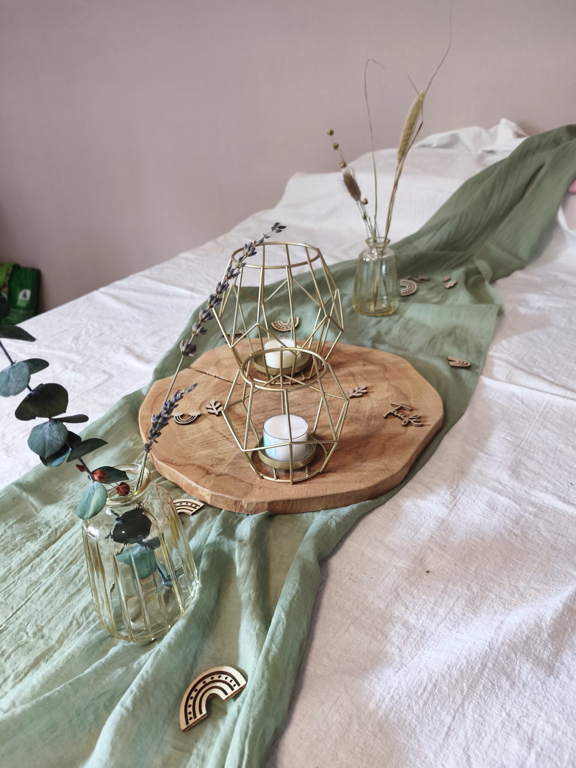 • In einem telefonischen Vorabgespräch informiert Ihr mich über eure Vorlieben. Ich packe eine für euch passende Auswahl meines Sortiments zusammen und bereite ein ungefähres Konzept vor. Gemeinsam dekorieren wir einen Probetisch in eurer Location oder bei euch Zuhause. Wir besprechen Details und arbeiten ein finales Konzept aus. Im Anschluss erhaltet Ihr von mir ein Angebot über eure Auswahl. Dieses könnt Ihr euch in Ruhe anschauen und mir ggf. Änderungen mitteilen.